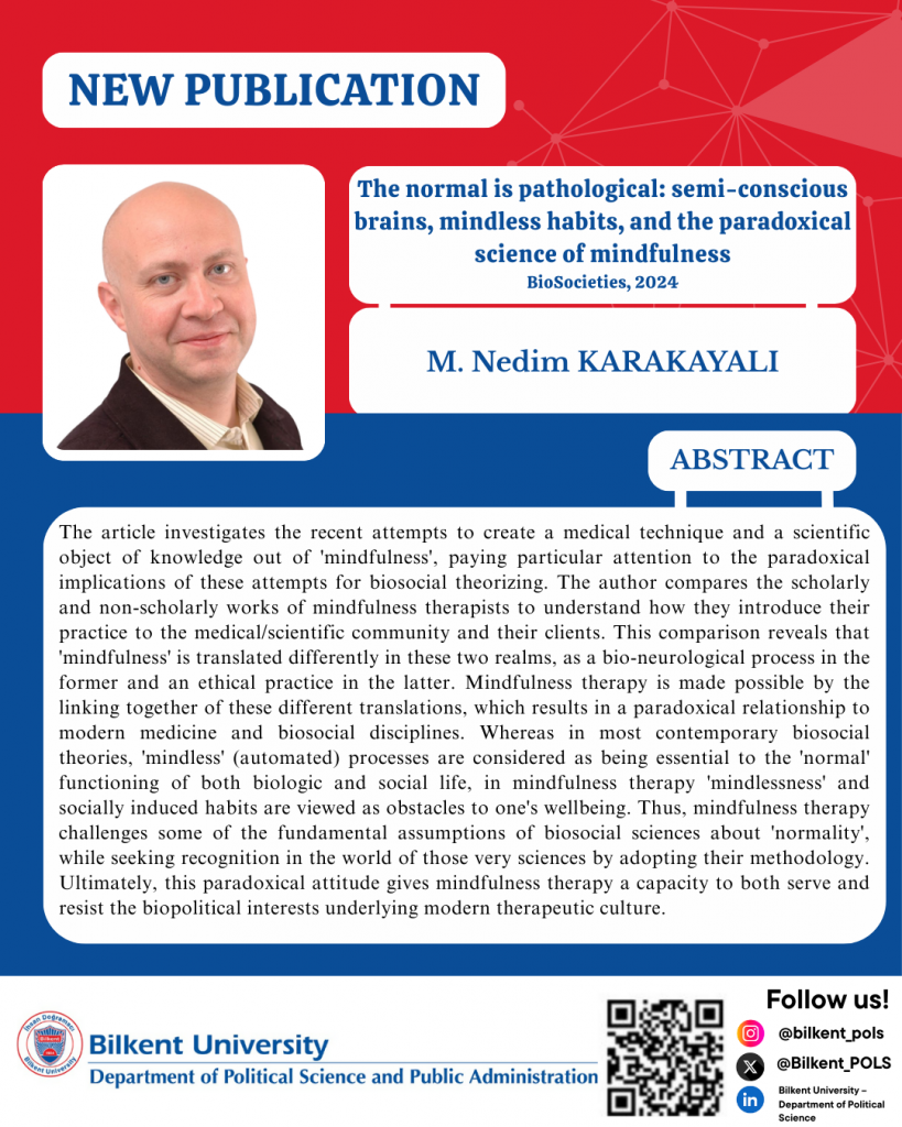 We are pleased to share that Dr. M. Nedim Karakayalı has published a new article, “The normal is pathological: semi-conscious brains, mindless habits, and the paradoxical science of mindfulness” in BioSocieties.