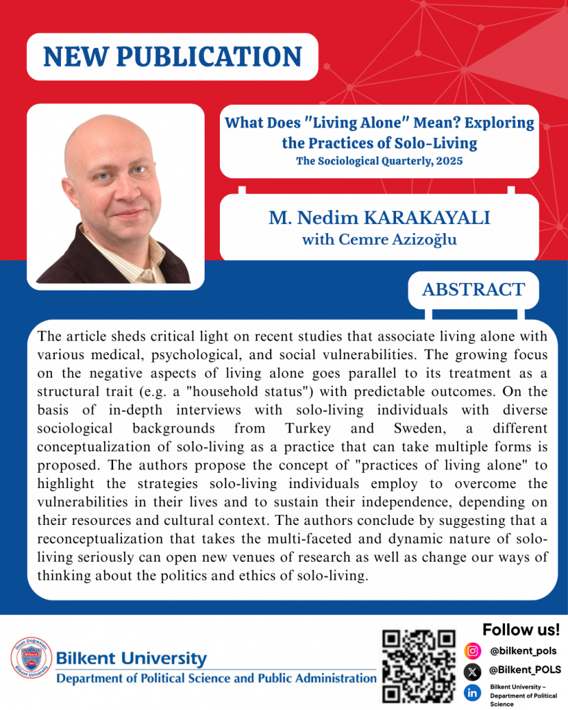 We are pleased to share that Dr. M. Nedim Karakayalı has published a new article, “What Does ‘Living Alone’ Mean? Exploring the Practices of Solo-Living” in The Sociological Quarterly.