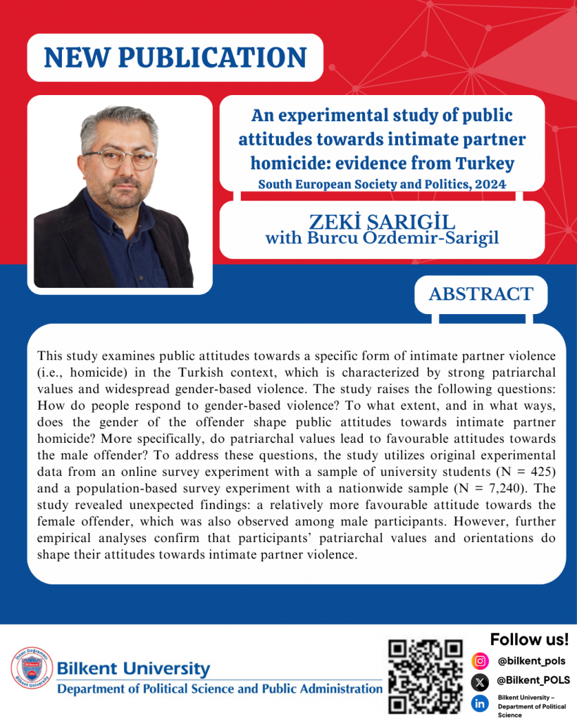 We are pleased to share that Dr. Zeki Sarıgil has published a new article, “An experimental study of public attitudes towards intimate partner homicide: evidence from Turkey,” in South European Society and Politics.